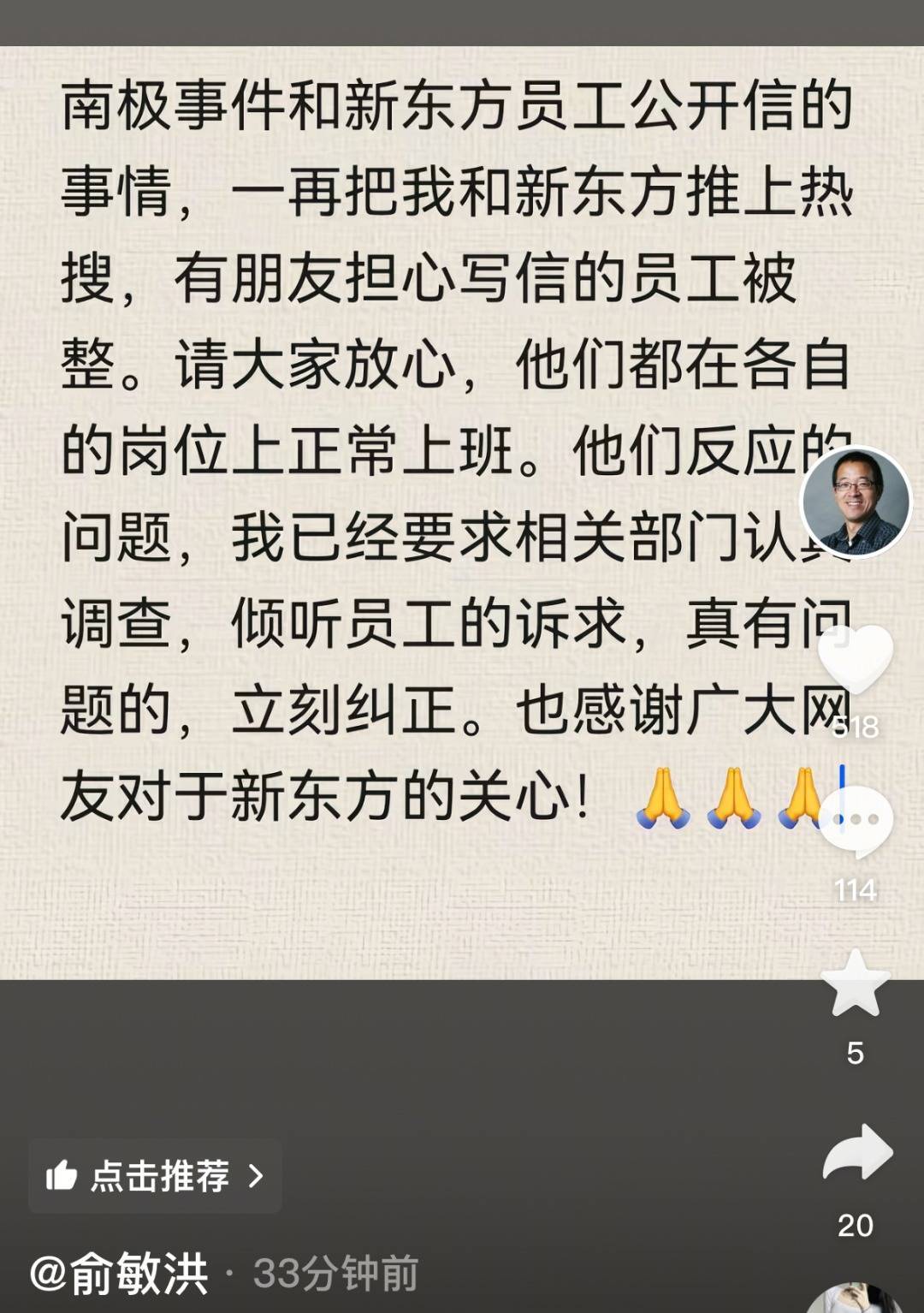 “南极事件和新东方员工公开信的事情,一再把我和新东方推上热搜,有朋友担心写信的员工被整。请大家放心,他们都在各自的岗位上正常上班。他们反映的问题,我已经要求相关部门认真调查,倾听员工的诉求,真有问题的,立刻纠正。”
